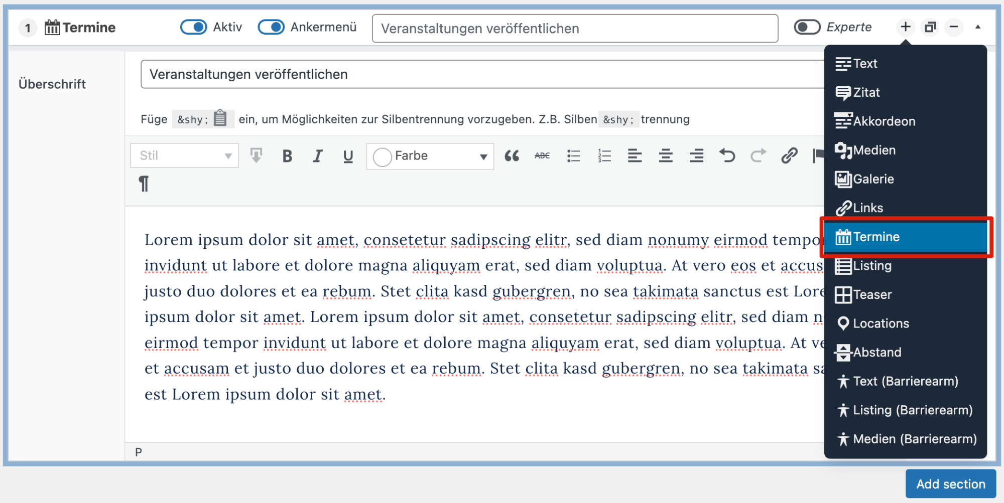 Termin-Modul auf Seiten des Typs Veranstaltung oder Institution