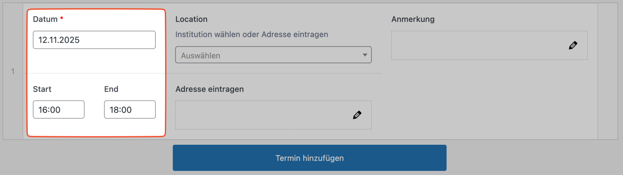 Wenn mehrere Termine an einem Veranstaltungsort stattfinden ist es dringend empfohlen für den Ort eine Institution anzulegen.