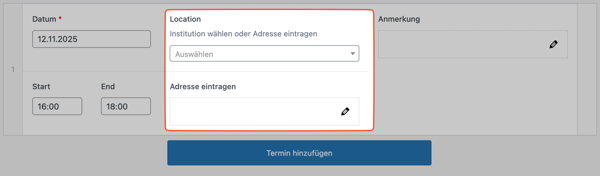 - Haben Sie den Veranstaltungsort nicht unter den Institutionen angelegt können Sie die Informationen frei eintragen.