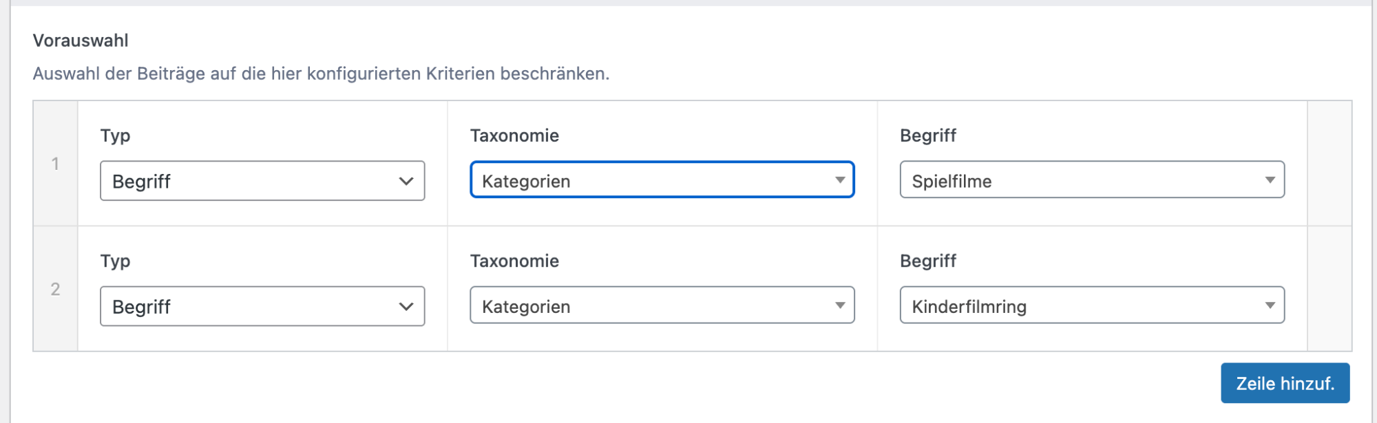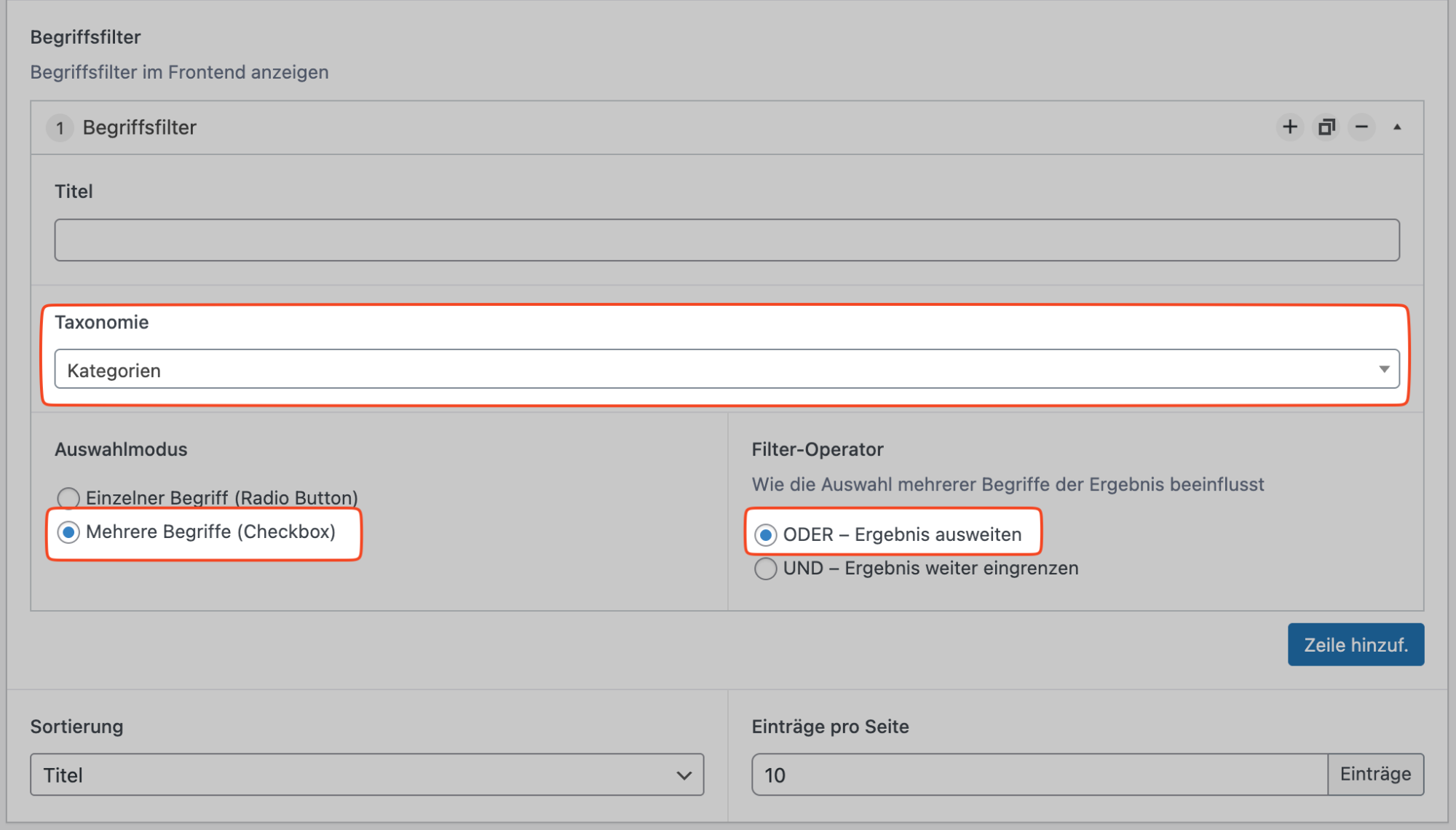 Wenn Sie dem Benutzer die Option geben wollen, die angezeigten Kategorien weiter einzugrenzen, legen Sie einen Begriffsfilter für die Frontend-Darstellungen an.